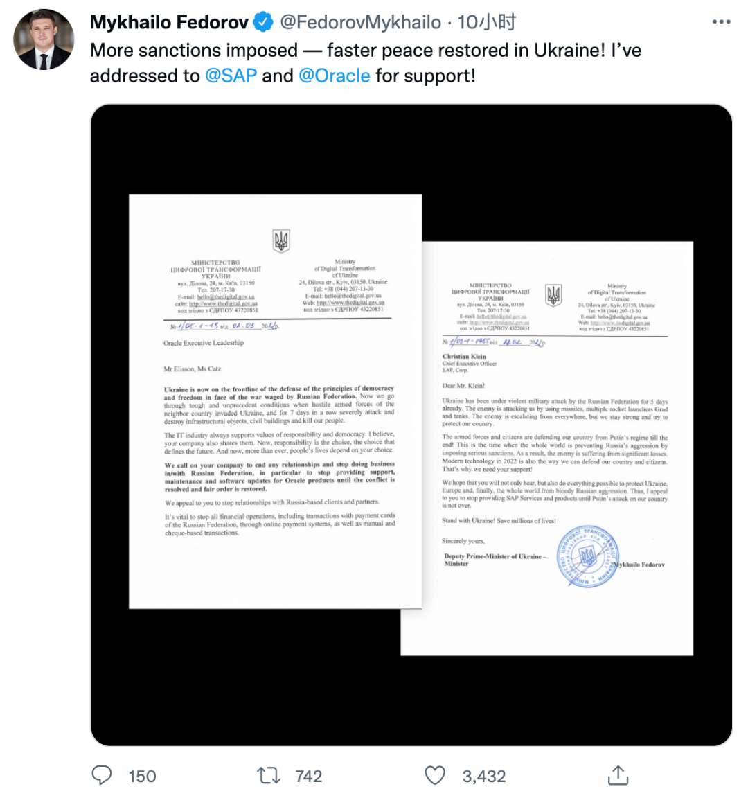 2022年3月2日,烏克蘭副總理兼數(shù)字化轉(zhuǎn)型部長(zhǎng)Mykhailo Fedorov在推特上曬出了發(fā)給Oracle聯(lián)合創(chuàng)始人兼首席技術(shù)官Larry Ellison、Oracle首席執(zhí)行官Safra Catz和SAP首席執(zhí)行官Christian Klein的兩封信的副本。