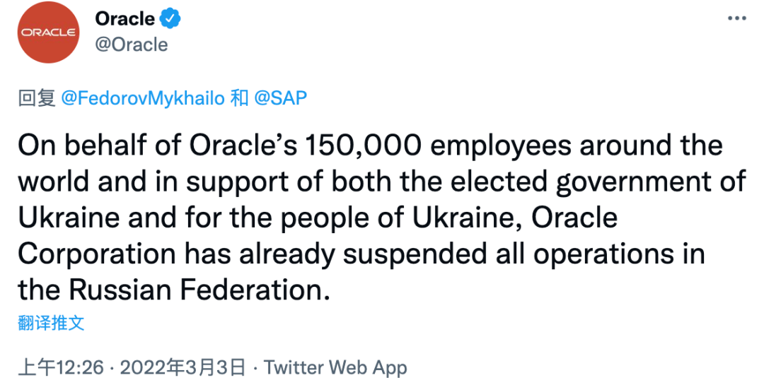 Oracle隨后發(fā)推文稱(chēng):“為了Oracle在全球各地的150000名員工的利益,為了支持烏克蘭民選政府和烏克蘭人民,Oracle公司已經(jīng)暫停了在俄羅斯聯(lián)邦的所有業(yè)務(wù)。”