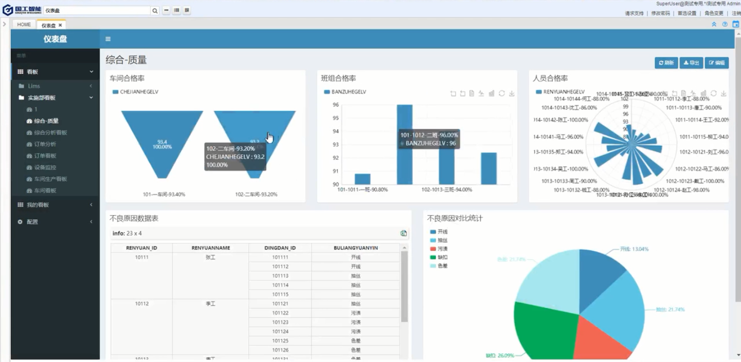 生產數據全部存儲在MES系統的數據庫中,任何需求都可以從數據庫中調取,產品的生產過程與工單關聯后,可以根據工單號對產品做追溯查詢,或者根據相應的關鍵字段就可以將產品的整個生產數據都調取出來。引入國工的大數據與人工智能平臺后,可以對產品的整個生產過程所產生的數據做分析,找到產品配方的最優配比或者產品穩定度最高的工藝參數設置值等;還可以根據產品的數據做出各種圖形化報表,分析報表,便于直觀的展示產品的各種數據,使數據的利用率達到最高。