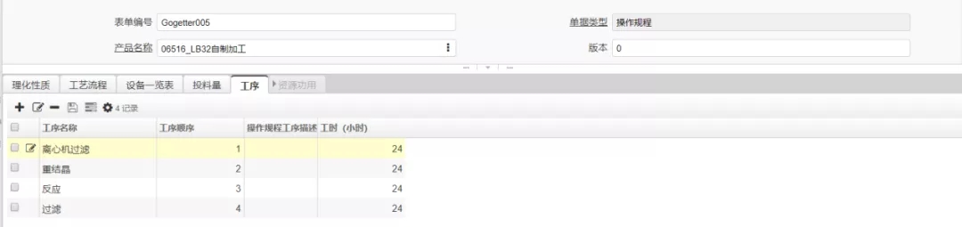 產(chǎn)品LB32自制加工的生產(chǎn)工序要求如下所示,需要4個工序,每個工序24小時,也就是1天。每個工序?qū)?yīng)該工序的所需操作功用,按照工序順序依次分別為吊帶離心、不銹鋼結(jié)晶、搪玻璃反應(yīng)、柱子過濾。