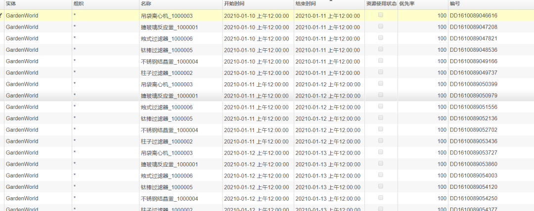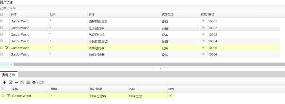 可用的排產(chǎn)資源如下圖,設(shè)備提供的資源功用分別對應(yīng)如下:搪玻璃反應(yīng)釜---搪玻璃反應(yīng)、柱子過濾器---柱子過濾、吊帶離心機(jī)--吊帶離心、不銹鋼結(jié)晶釜---不銹鋼結(jié)晶、鈦棒過濾器---鈦棒過濾、燭式過濾器---燭式過濾。