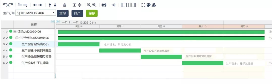 生產(chǎn)訂單任務(wù)以及設(shè)備資源創(chuàng)建維護(hù)好之后,根據(jù)業(yè)務(wù)模型以及約束型求解器的約束規(guī)范編寫約束算法。使用盡早生產(chǎn)排產(chǎn)方案,根據(jù)所生產(chǎn)的產(chǎn)品LB32自制加工對應(yīng)的生產(chǎn)工序要求,按照工序順序以及每個工序?qū)?yīng)的所需的資源功用去匹配設(shè)備的可用時間資源,配合約束型求解器對應(yīng)的 硬分,軟分的約束機(jī)制,獲取該產(chǎn)品生產(chǎn)訂單的生產(chǎn)計劃如下: