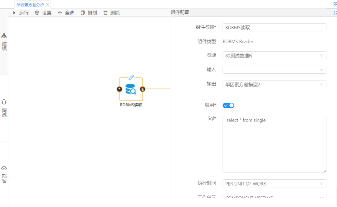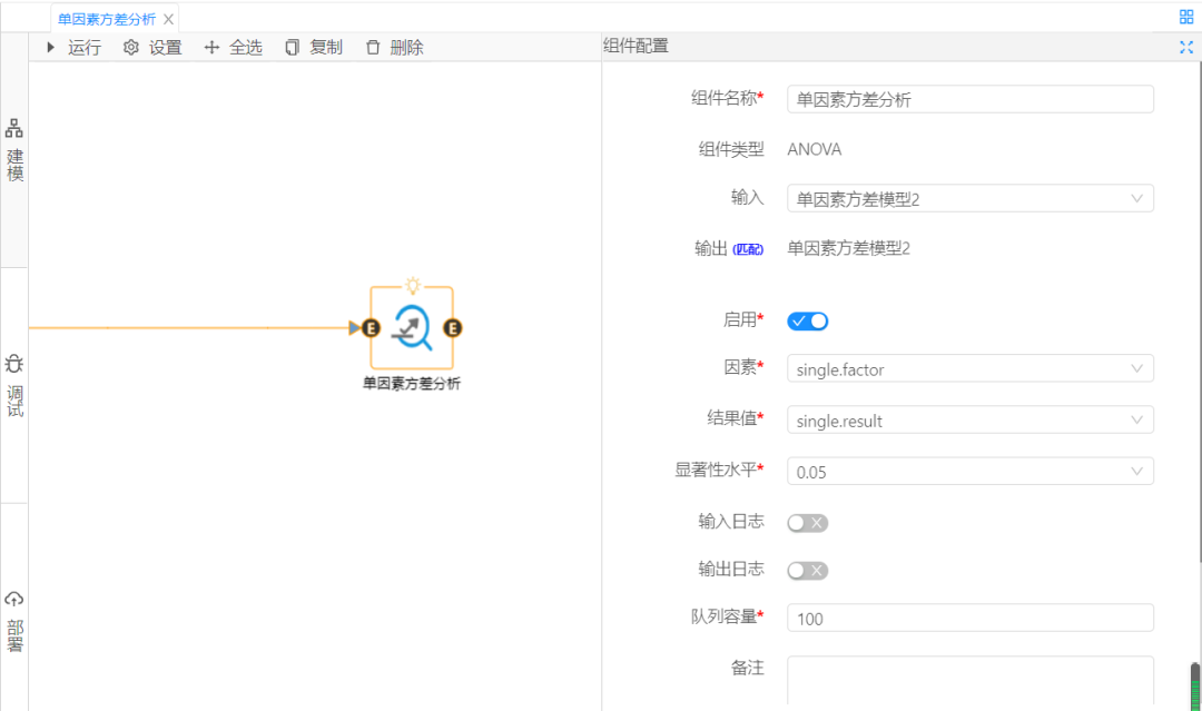 使用集成好算法的單因素方差分析組件進(jìn)行數(shù)據(jù)的單因素分析處理,對(duì)組件參數(shù)進(jìn)行設(shè)置,因素字段配置為factor,結(jié)果值配置為檢驗(yàn)結(jié)果result,顯著性水平設(shè)置為0.05,單擊運(yùn)行,從調(diào)試面板中查看分析結(jié)果。