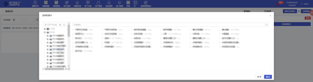 以某一特定設(shè)備為例,使用平臺數(shù)據(jù)分析功能,將平臺中的有效數(shù)據(jù)進(jìn)行分析。根據(jù)用戶的需要,對一段時間內(nèi)的歷史數(shù)據(jù)或?qū)崟r數(shù)據(jù)按照一定的統(tǒng)計頻率進(jìn)行多個維度的數(shù)據(jù)分析,統(tǒng)計頻率包含不限、10秒、30秒、5分鐘、10分鐘、30分鐘、1小時,通過添加變量操作,在彈出的變量選擇彈窗中可多選數(shù)據(jù)點信息,可以通過資產(chǎn)樹選中資產(chǎn)來選擇數(shù)據(jù)信息或者直接通過模糊搜索查找數(shù)據(jù)點。數(shù)據(jù)分析得到的圖表顯示形式包括折線圖以及表格形式。多個數(shù)據(jù)點信息圖表的展示形式包括平鋪、疊加、標(biāo)簽顯示以及合并表格顯示,根據(jù)不同的需求選擇對應(yīng)的展示形式,靈活性高。數(shù)據(jù)分析幫助用戶分析用戶想要分析的內(nèi)容,如數(shù)據(jù)走向、問題等,從而幫助用戶解決問題。