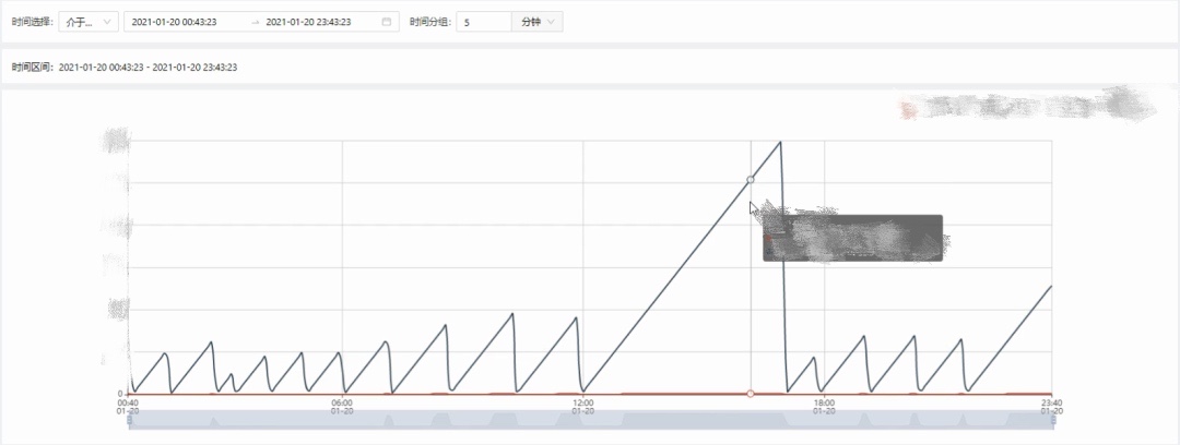 這是現(xiàn)場某一設(shè)備的濾網(wǎng)使用時間分析,按照正常的生產(chǎn)流程,要求單個濾網(wǎng)的使用周期不得超過60分鐘。從上圖的分析中我們可以看出,在早上6點鐘之前,濾網(wǎng)的更換較為頻繁,基本都在60分鐘以內(nèi)。但在6點之后,濾網(wǎng)的更換周期基本在80~90分鐘,其中更是有一次使用時間達(dá)到了300分鐘,這就屬于嚴(yán)重超時,肯定會對產(chǎn)品質(zhì)量產(chǎn)生影響,同時也可能會對設(shè)備產(chǎn)生磨損。
